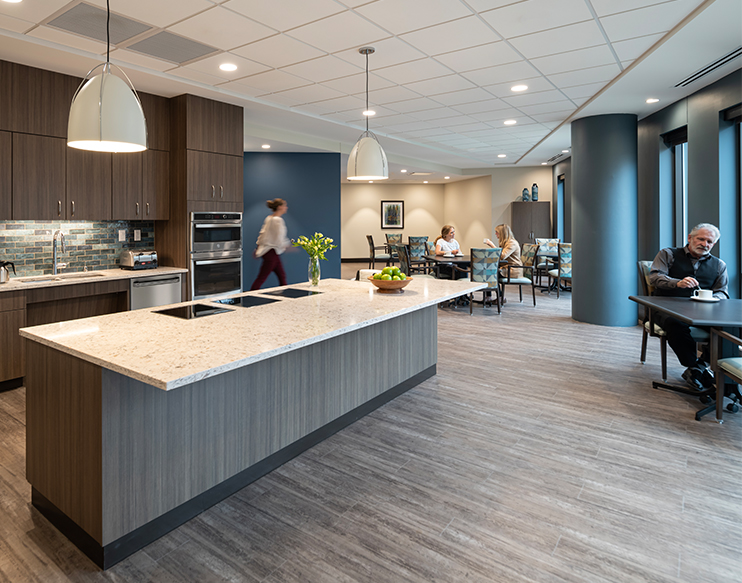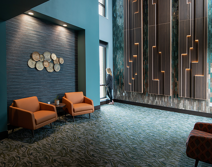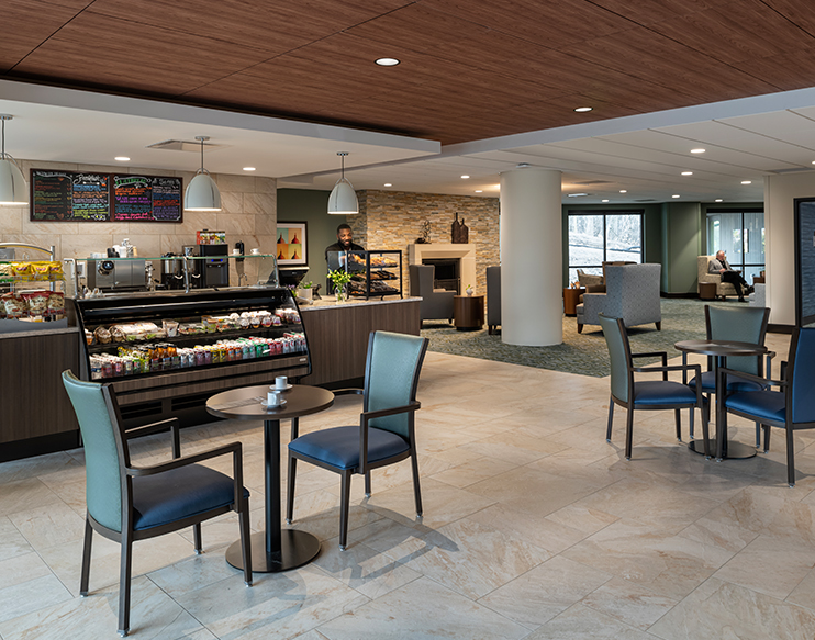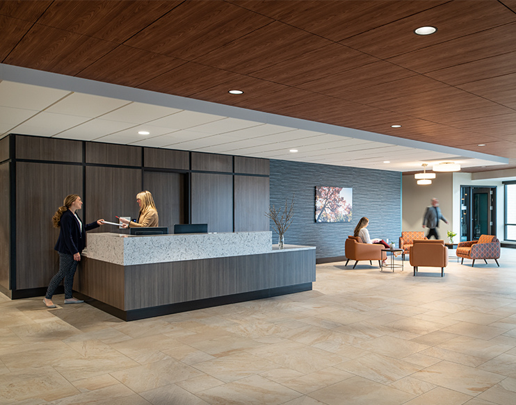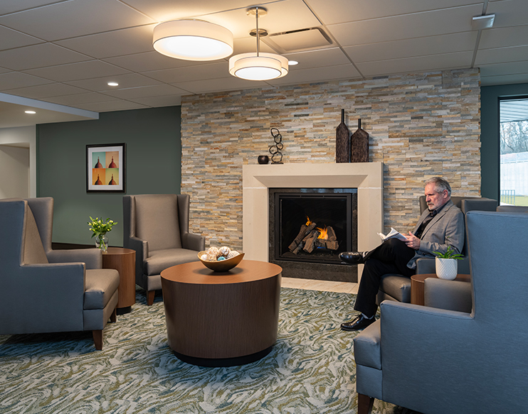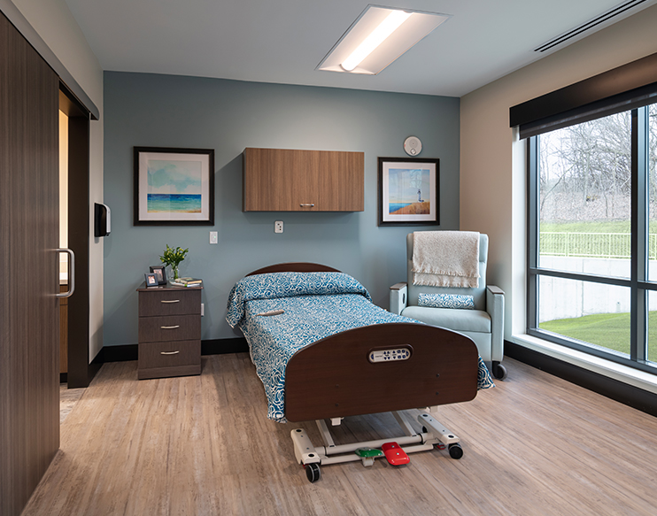 Creative Business Interiors provided furniture design services for all areas of the building and guided the Oakwood team in a selection process that yielded the best products for their unique and sensitive clients (including considering equity for hospice and bariatric patients). Further guidance was provided for the development of staff workstation typicals and nursing stations, as well as furnishings for the physical therapy gym, meditation space, salon, and pharmacy.